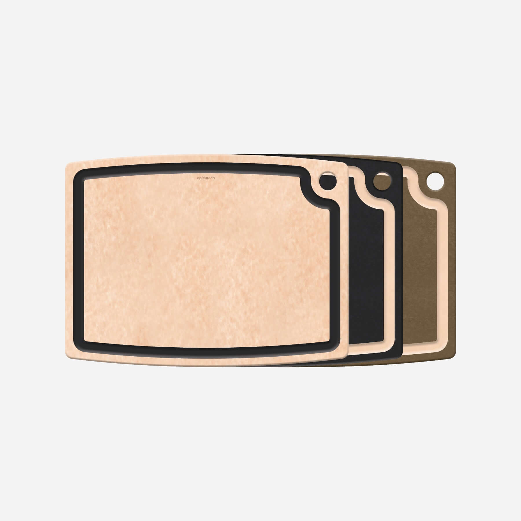 The thicker profile of the durable Gourmet Series Cutting Board allows room for a juice groove feature on one side to capture liquids and keep countertops clean. The larger prep space on the non-juice groove side gives you room to play and a dual color combination adds a simple elegance to your countertop.